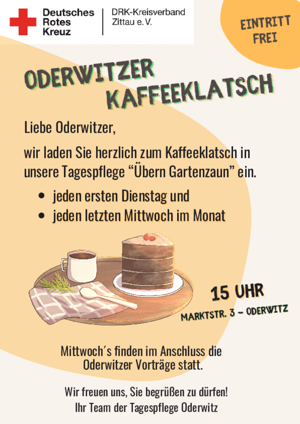 Freuen Sie sich auf duftenden Kaffee, leckeren Kuchen und vor allem auf nette Gespräche in vertrauter Runde.